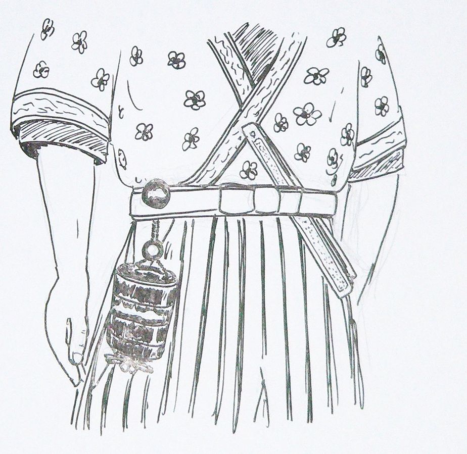 Sketch of a netsuke and an inro box on traditional Japanese garments. | Rama