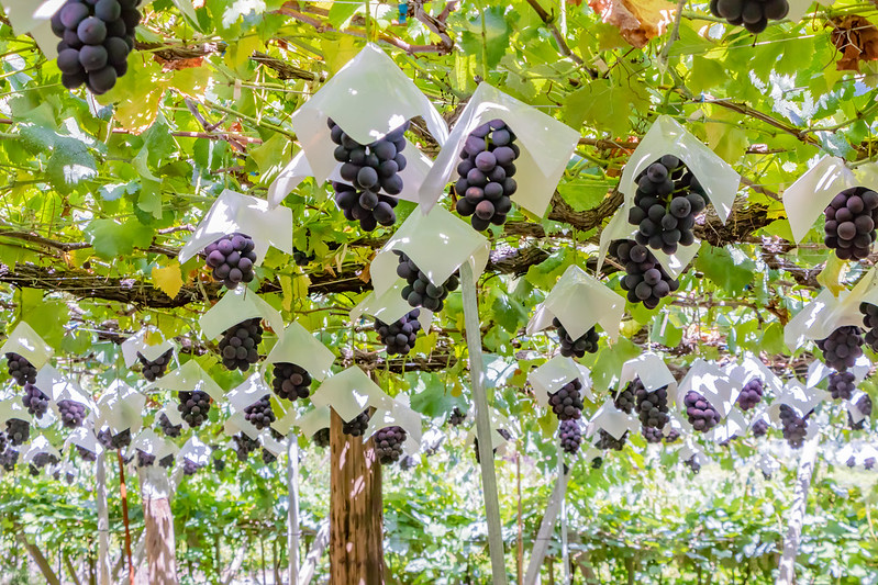 Kyoho grapes or “giant mountain grapes” are a cross between Ishiharawase and Centennial grape varieties. They are large, dark purple to almost black in color, and have thick skin. They can sometimes grow as big as plums and are usually peeled before being eaten. The flesh is juicy and sweet with mild acidity. Kyoho grapes were first produced in 1937 in Shizuoka Prefecture but were only named in 1946. They are produced today mainly in the prefectures of Nagano and Yamanashi.